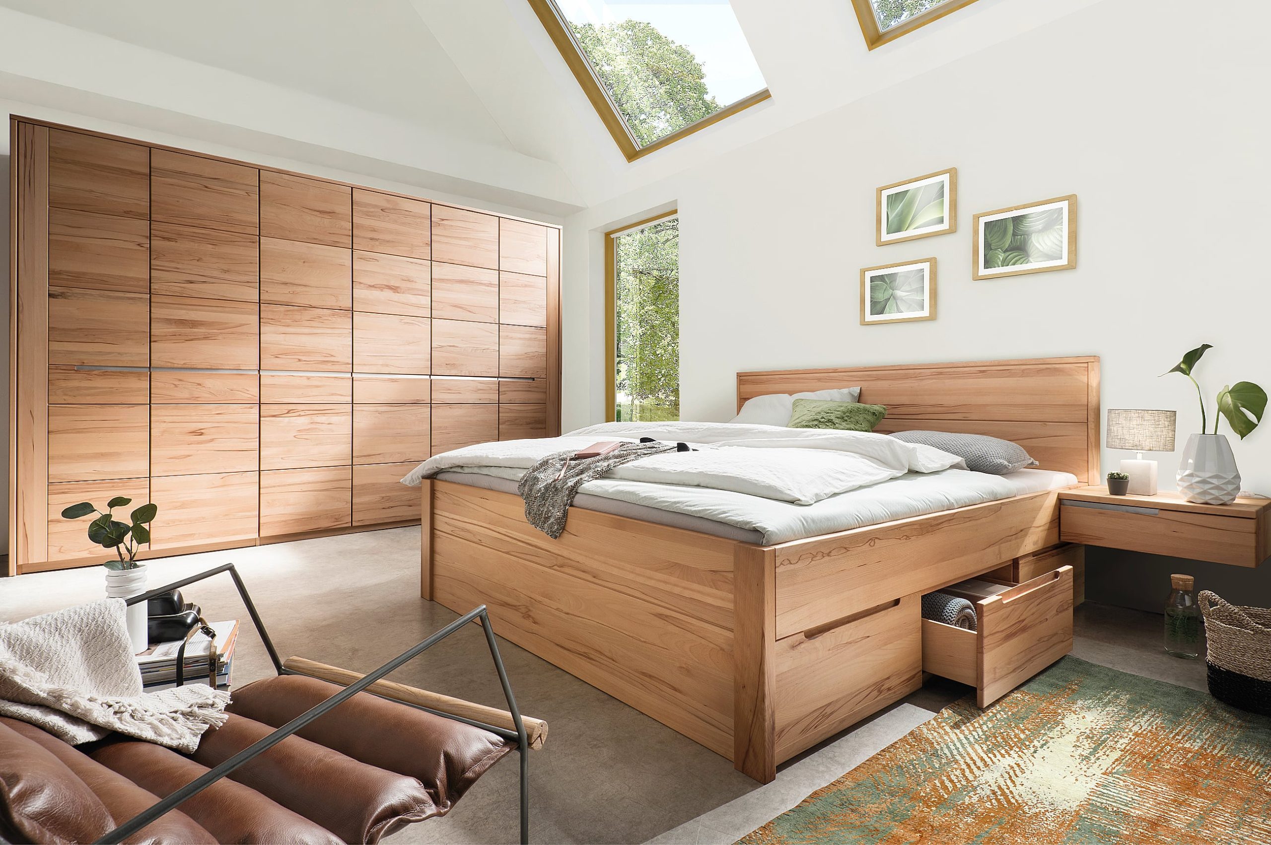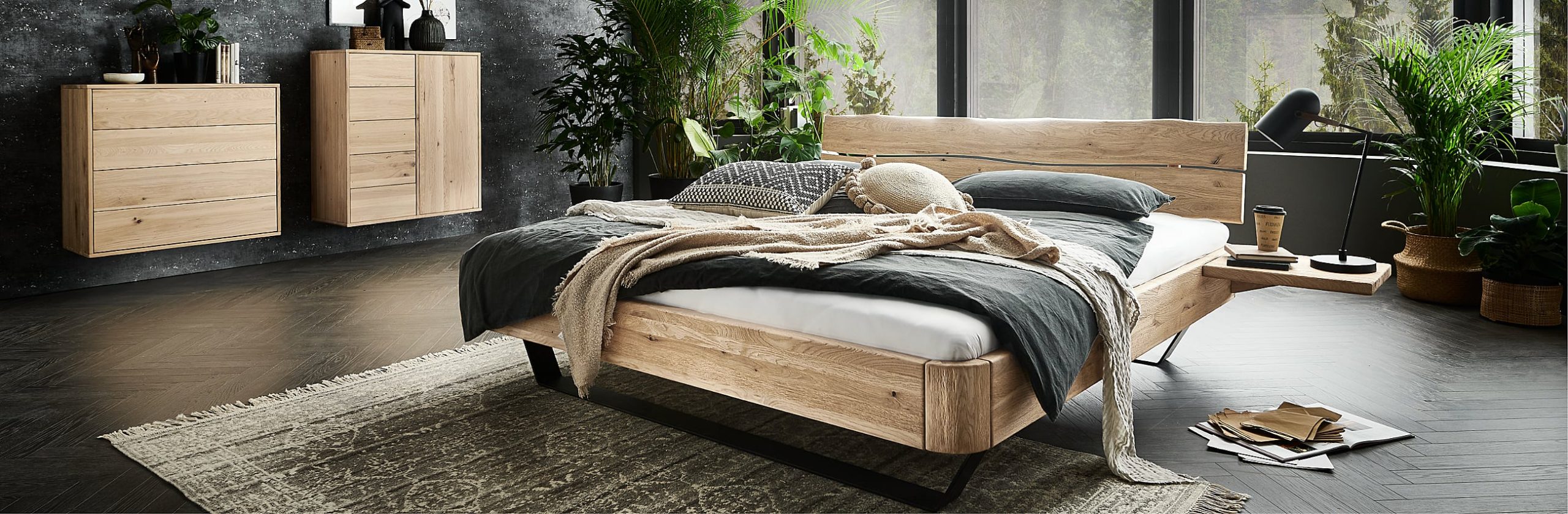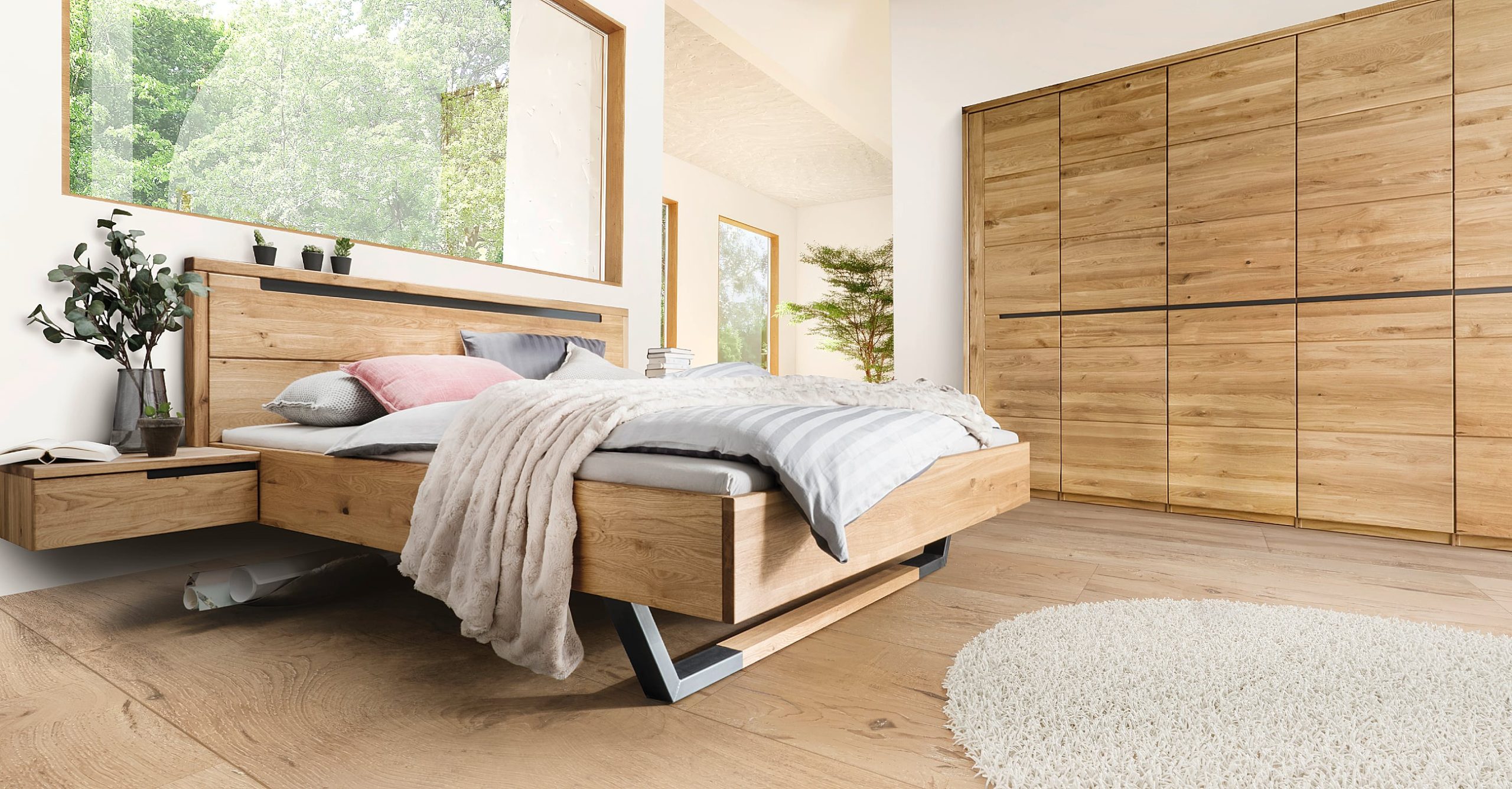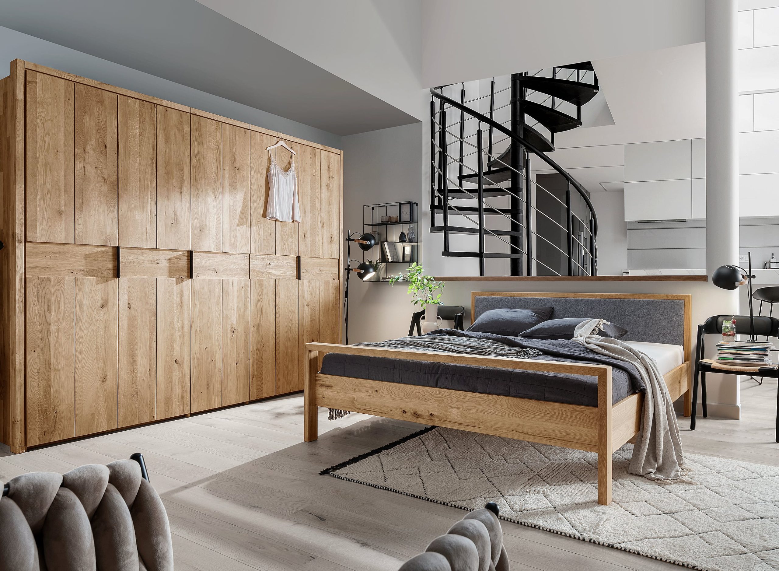 - Fronten, Betten und Nachtkonsolen sind aus Massivholz in Wildeiche oder Kernbuche gefertigt, Oberflächen sind geölt