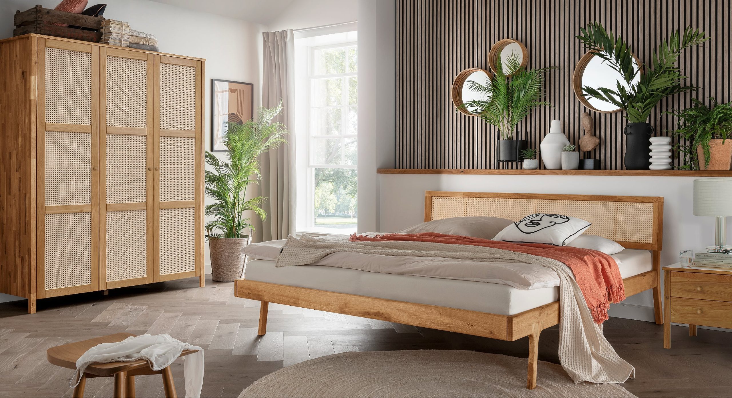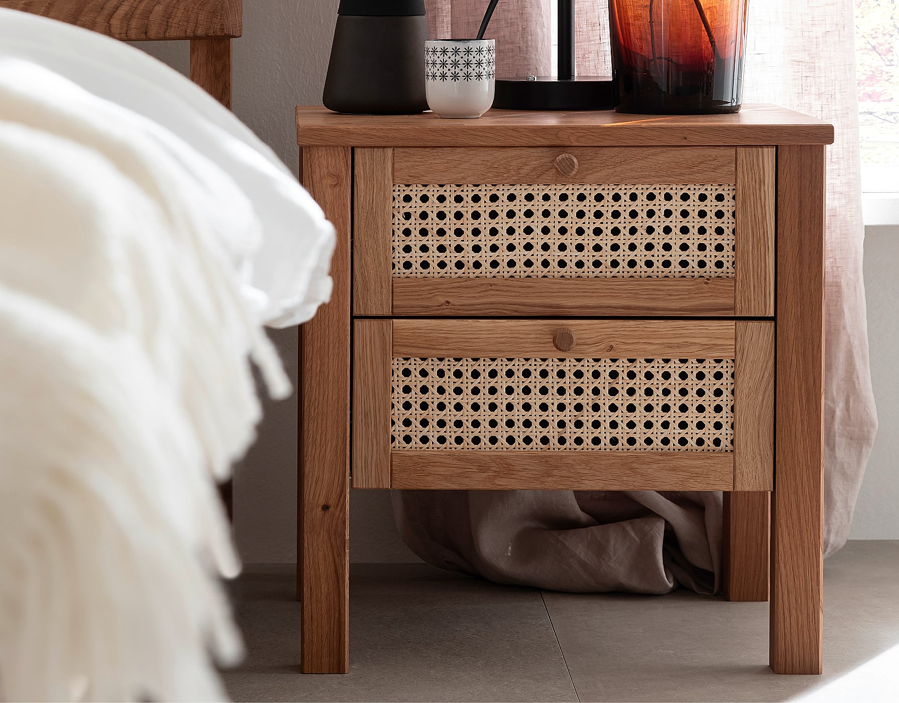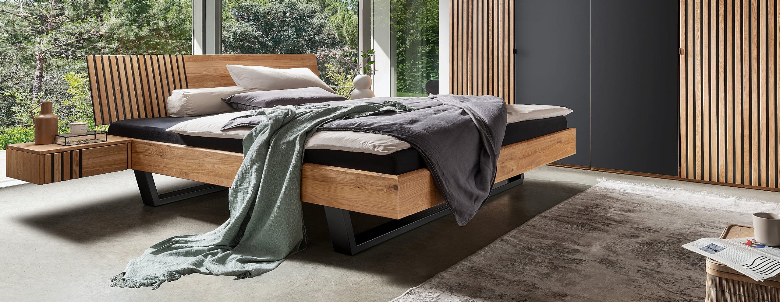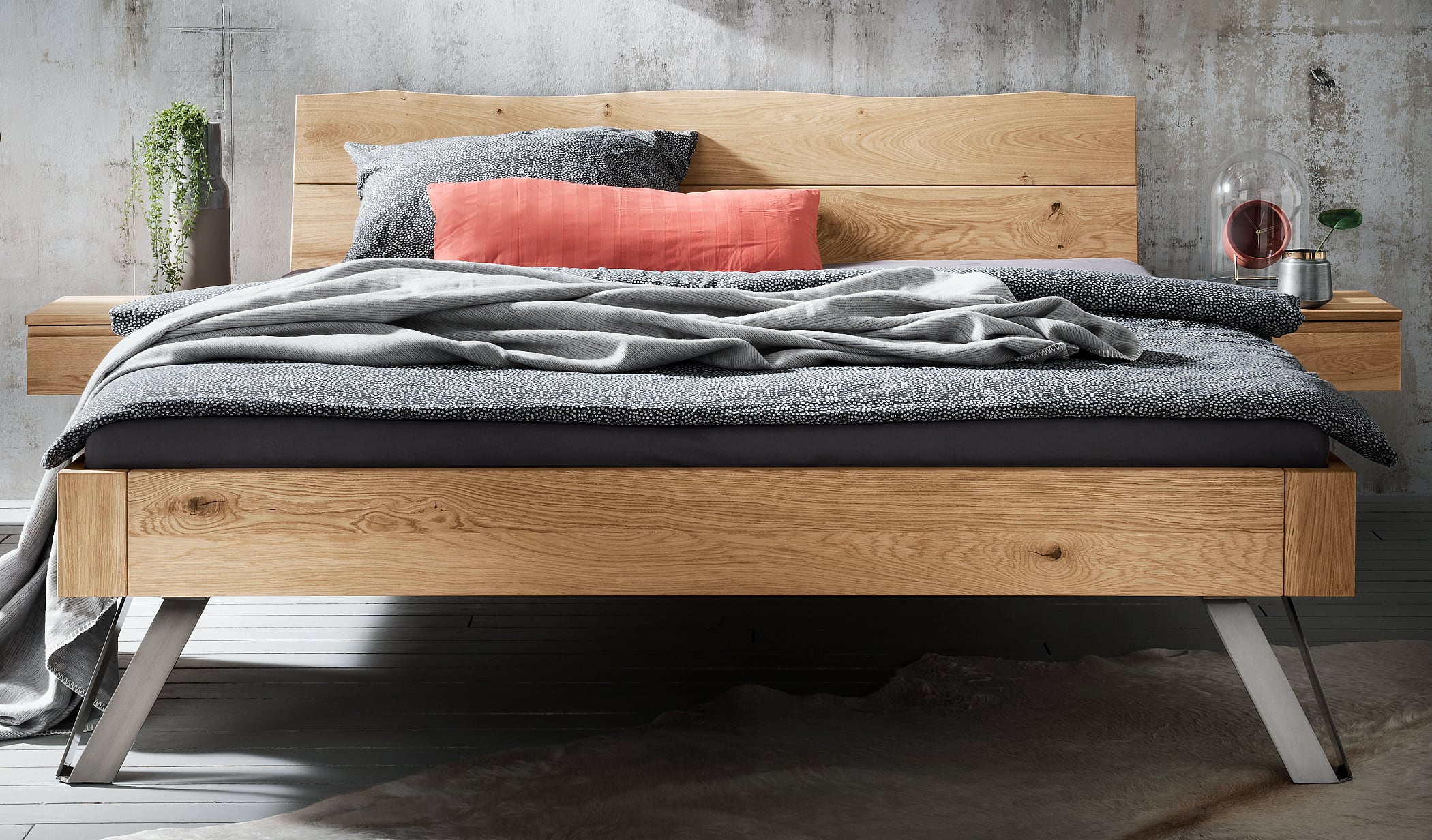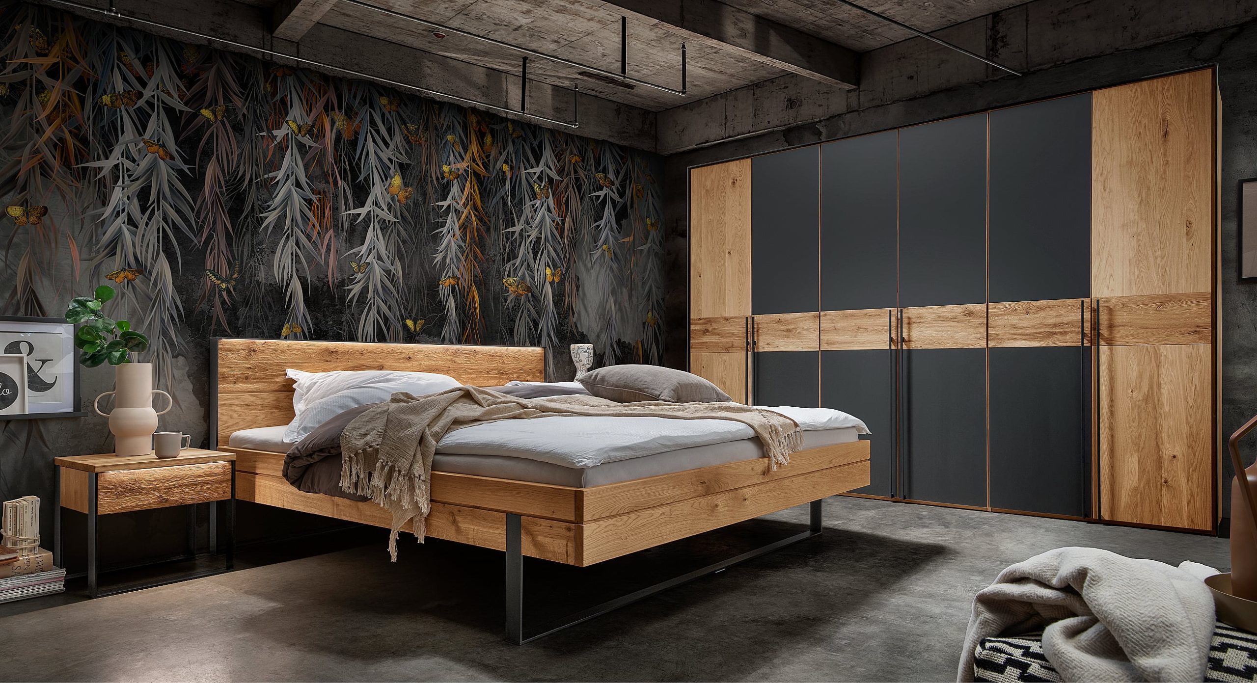 - Fronten, Betten und Nachtkonsolen sind aus Massivholz in Wildeiche oder Kernbuche gefertigt, Oberflächen sind geölt