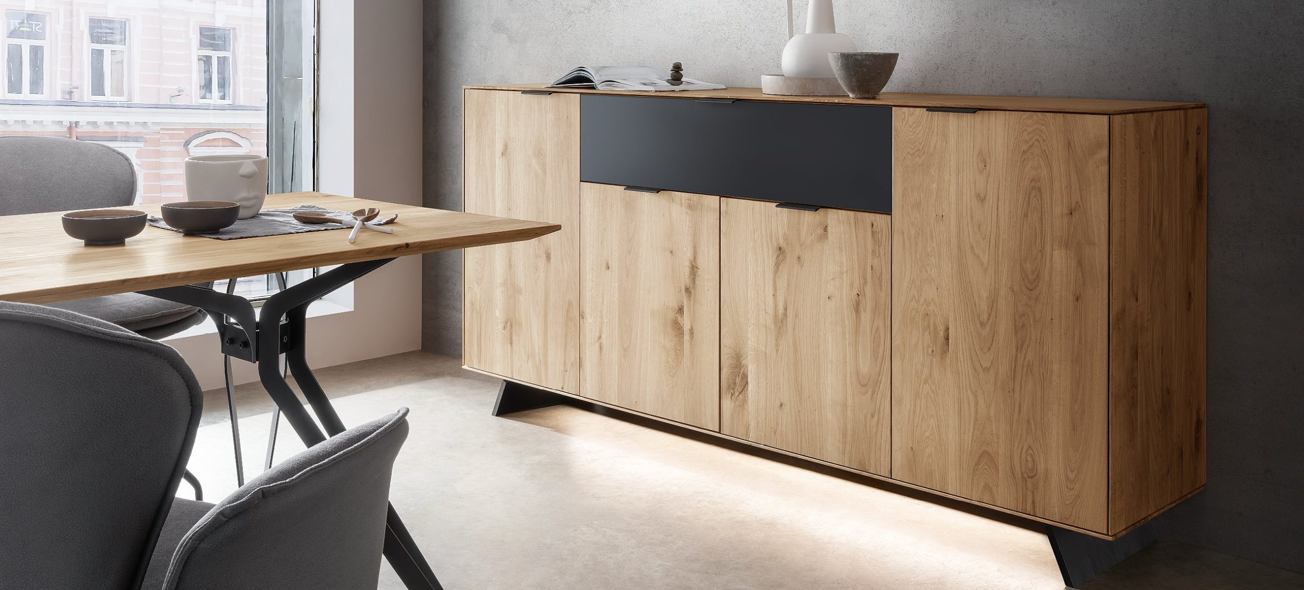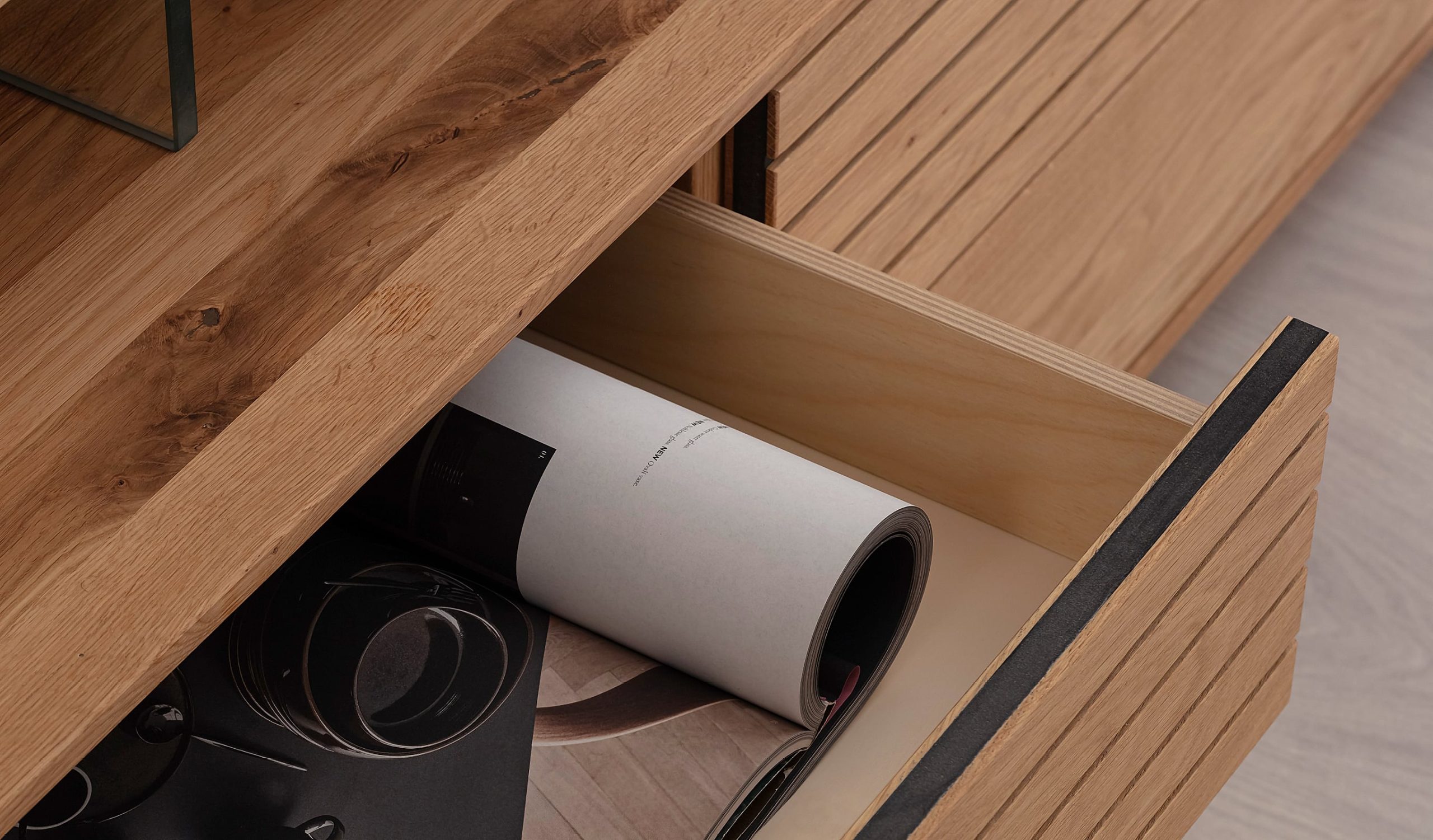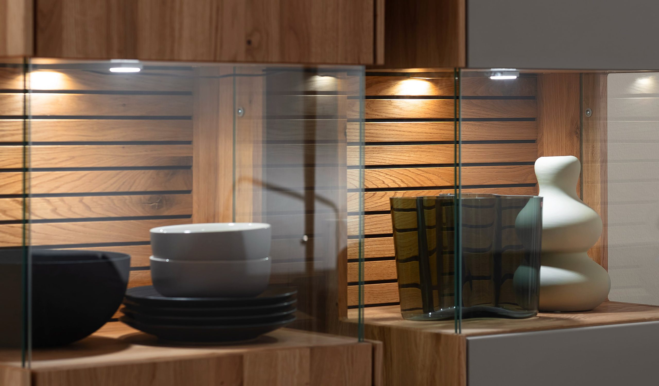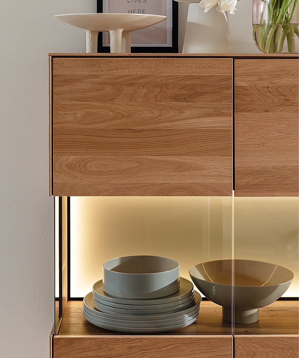 - Sideboards, Vitrinen, Lowboards und mehr – clevere Details wie Schubkästen mit Vollauszügen und Glasklappen