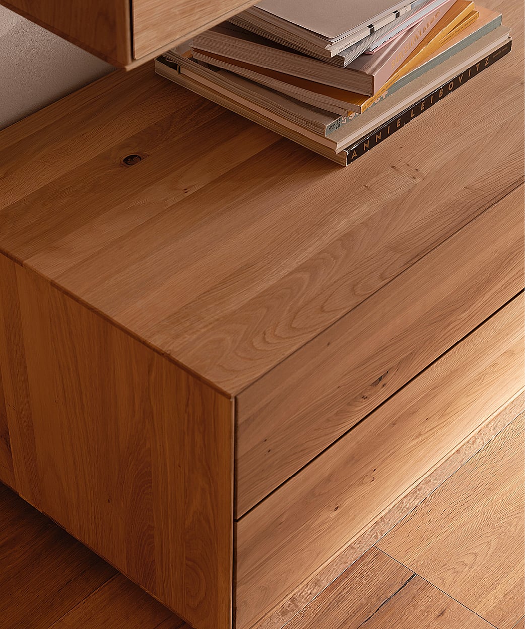 - Massivholzprogramm. Erhältlich in Wildeiche, Bianco geölt oder Natur geölt. Mit oder ohne Hirnholz-Applikationen