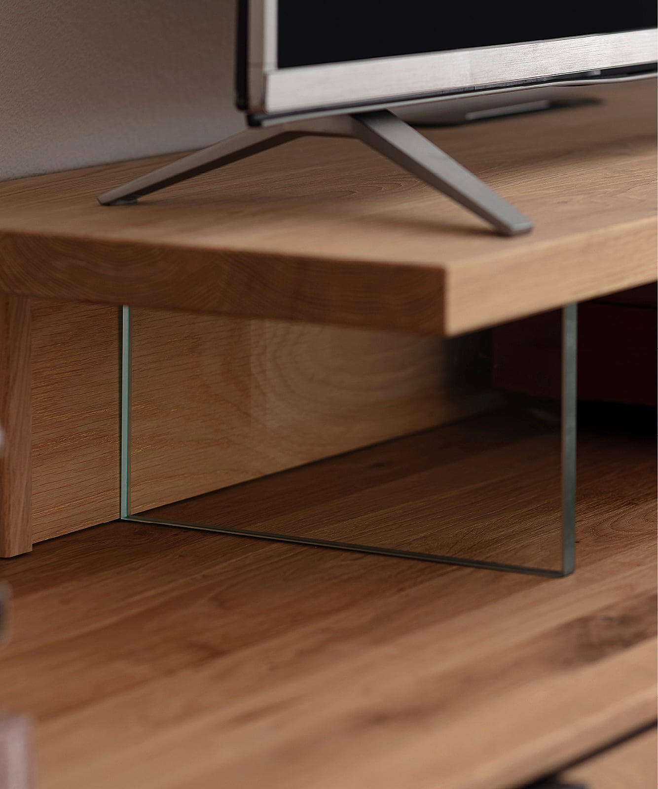 - Massivholz (z.B. Eiche Massiv geölt) trifft auf edles Weißglas